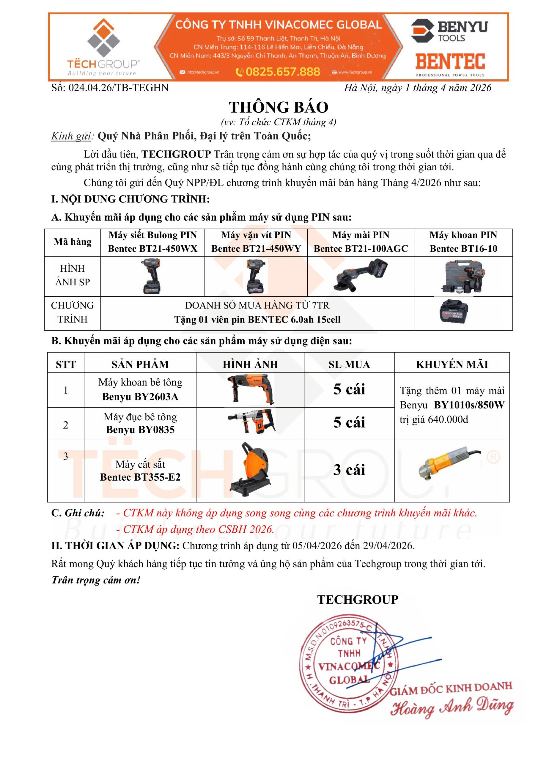 Techgroup trân trọng gửi đến Quý Nhà Phân Phối và Đại lý chương trình ưu đãi đặc biệt diễn ra từ ngày 05/04/2026 đến 29/04/2026.
